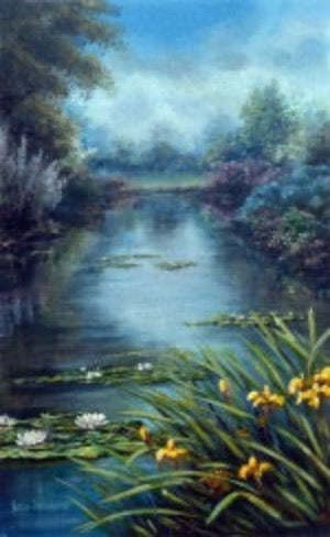 As you look along the calm reflective river into the hazy distant landscape your gaze follow sthe beautiful, colourful display of wildflowers and shrubbery