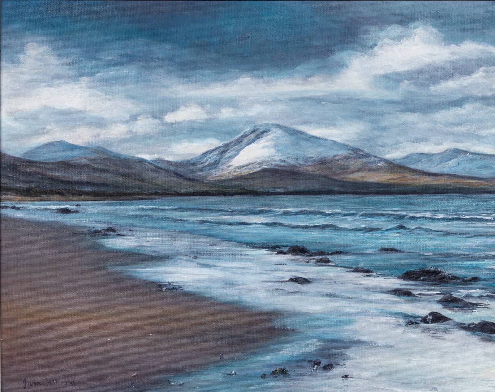 A frosty winters morning on Derry more beach with snowcapped mountains. Tralee Bay County Kerry Ireland