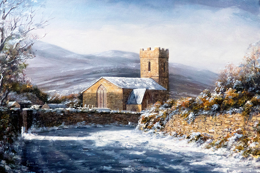 The snow-covered road winds toward Killiney church near Castlegregory, Co, Kerry
